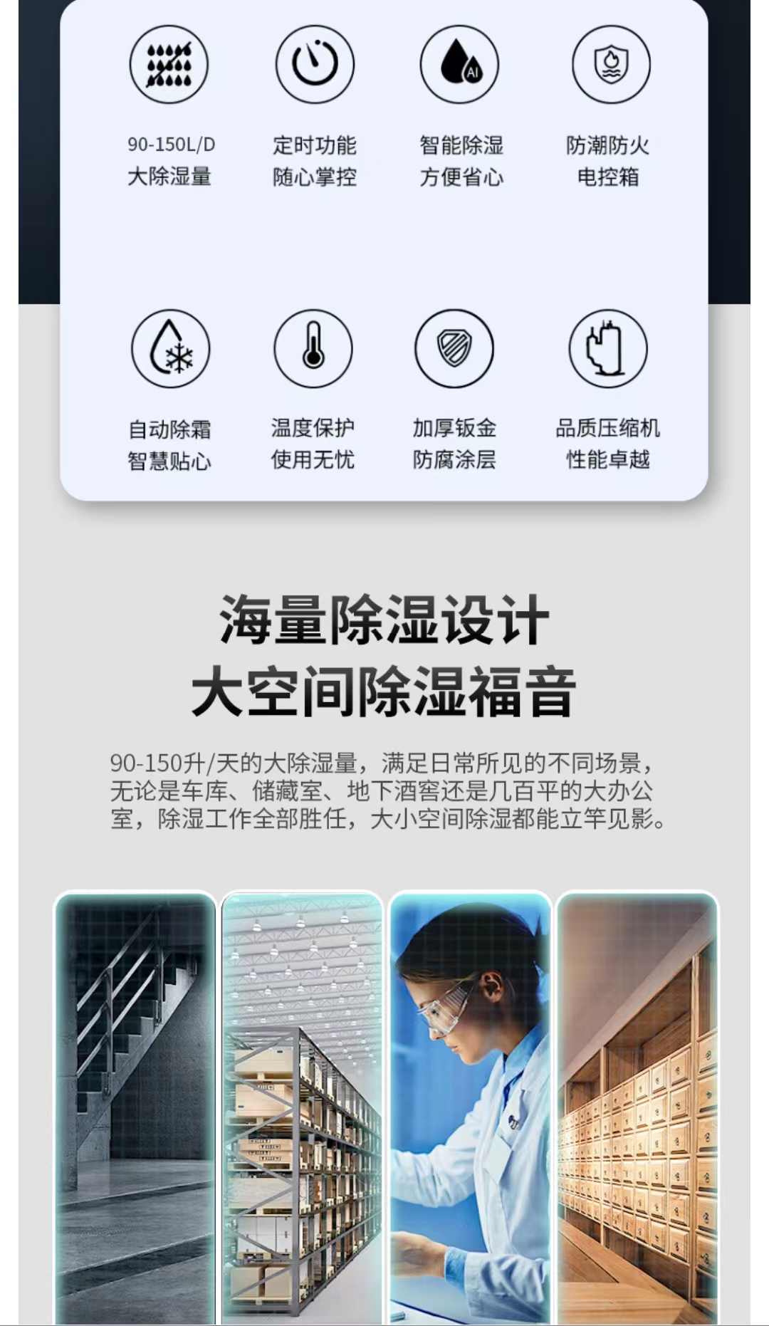 工業(yè)除濕機(jī)企業(yè)、單位使用較多,主要用于工廠車間、地下車庫、倉庫、檔案室、圖書館、電腦機(jī)房等大面積除濕場所