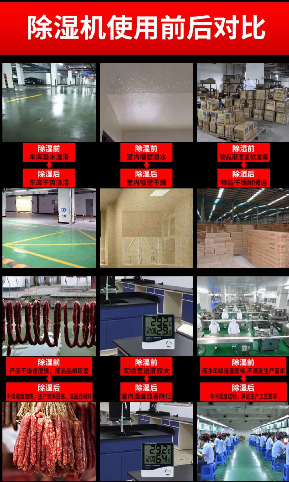 可防受潮變質(zhì)藥品、食物、砂糖和其他容易受潮物品的質(zhì)量只有在相對濕度低的環(huán)境中才能得到保證 可為建筑除濕、無論是新落成還是發(fā)生過水害的建筑,最有效的方法就是采用除濕機(jī)除濕