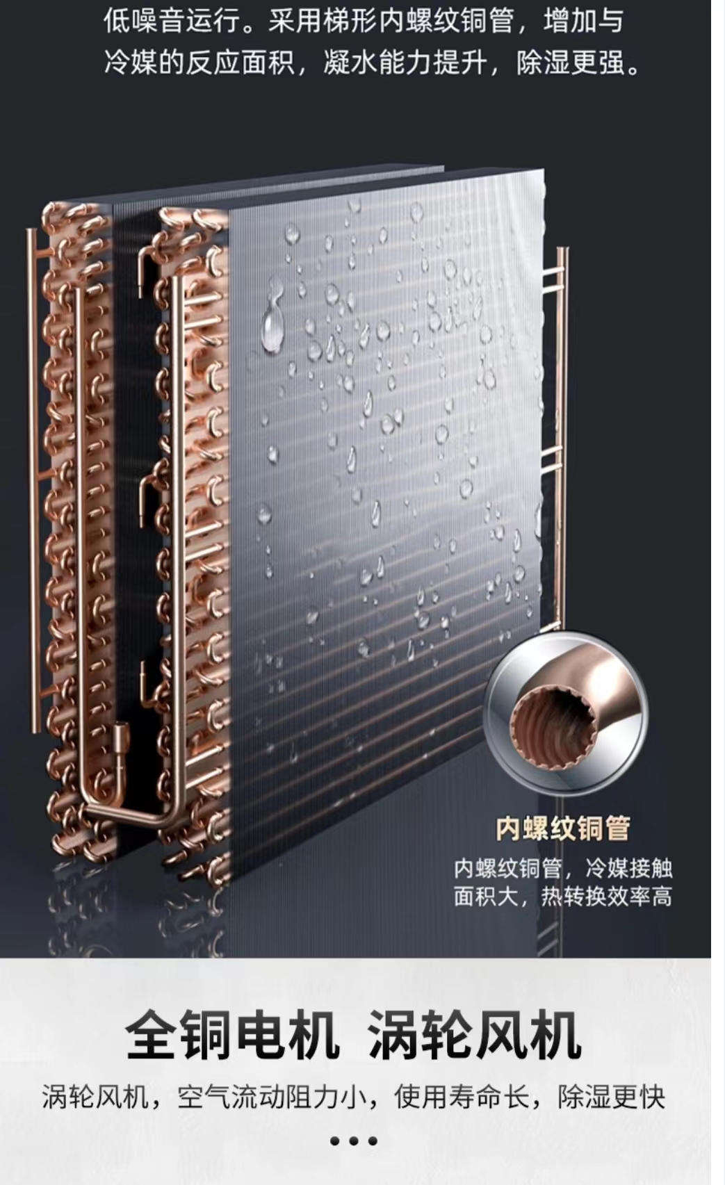 除濕機(jī)主要有壓縮機(jī)、熱交換器、風(fēng)扇、盛水器、機(jī)殼及控制器等組成,其工作原理是:由風(fēng)扇將潮濕空氣抽入機(jī)內(nèi),通過熱交換器,此時空氣中的水分子冷凝成水珠,處理過后的干燥空氣排出機(jī)外,如此循環(huán)使室內(nèi)濕度保持在適宜的相對濕度。