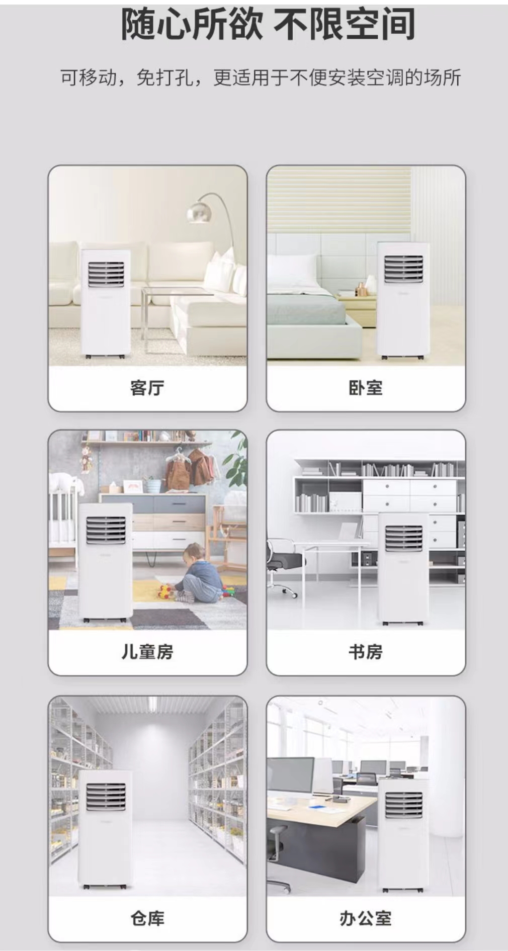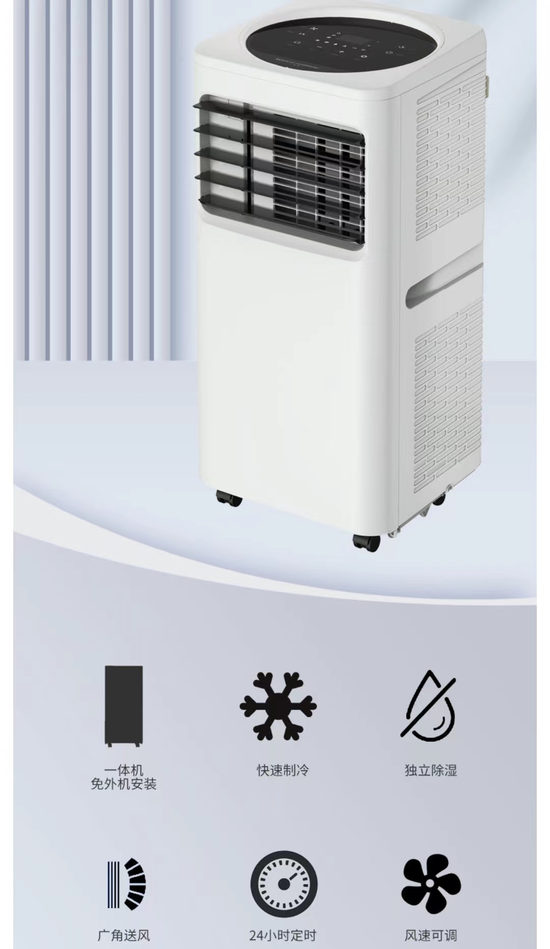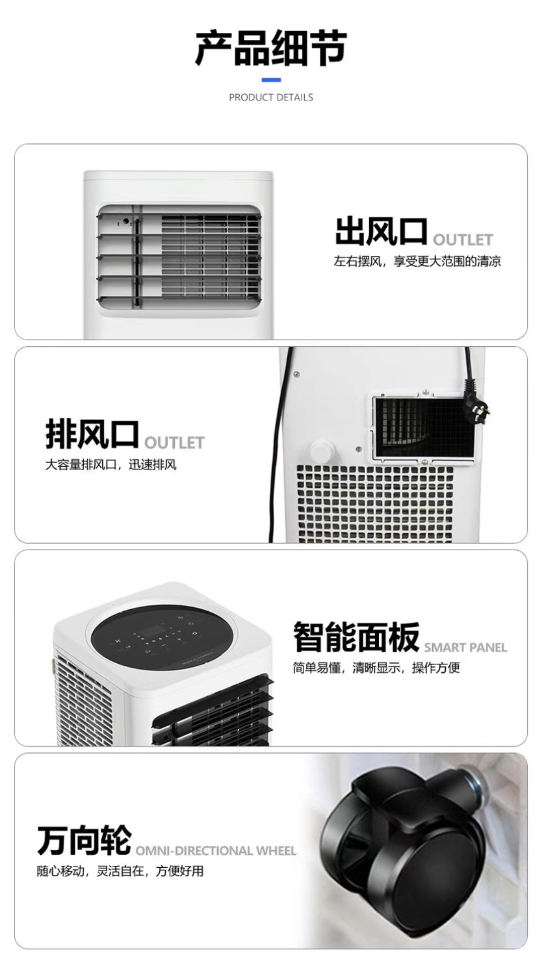 2、方便實(shí)用,移動式空調(diào)的底部都安裝有滾輪,在使用的過程中,用戶可以將移動式空調(diào)移動到任何自己需要的地方進(jìn)行使用,實(shí)用性很高,也很方便