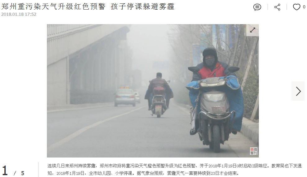 連續(xù)幾日來鄭州持續(xù)霧霾,鄭州市政府將重污染天氣橙色預(yù)警升級(jí)為紅色預(yù)警,并于2018年1月19日0時(shí)啟動(dòng)I級(jí)響應(yīng)。教育局也下發(fā)通知,2018年1月19日,全市幼兒園、小學(xué)停課。據(jù)氣象臺(tái)預(yù)報(bào),霧霾天氣一直要持續(xù)到23日才會(huì)結(jié)束。