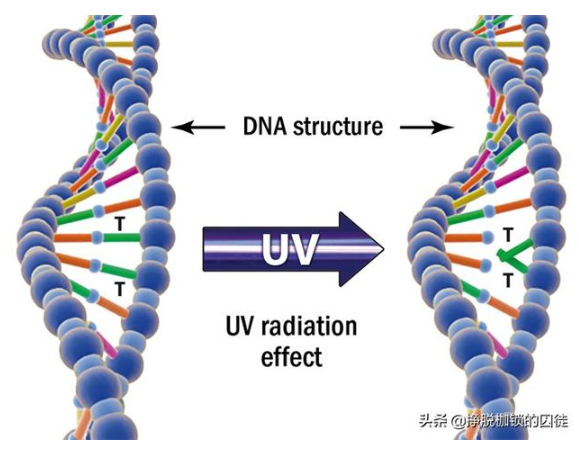 到1960年,紫外線生物效應(yīng)基本機(jī)制揭曉:紫外線-C(UVC)可以使生物細(xì)胞染色體上兩個(gè)相鄰胸腺嘧啶之間形成嘧啶二聚體,即紫外線直接作用于生物細(xì)胞遺傳物質(zhì),是殺菌和誘變(致癌)的生物學(xué)基礎(chǔ)。