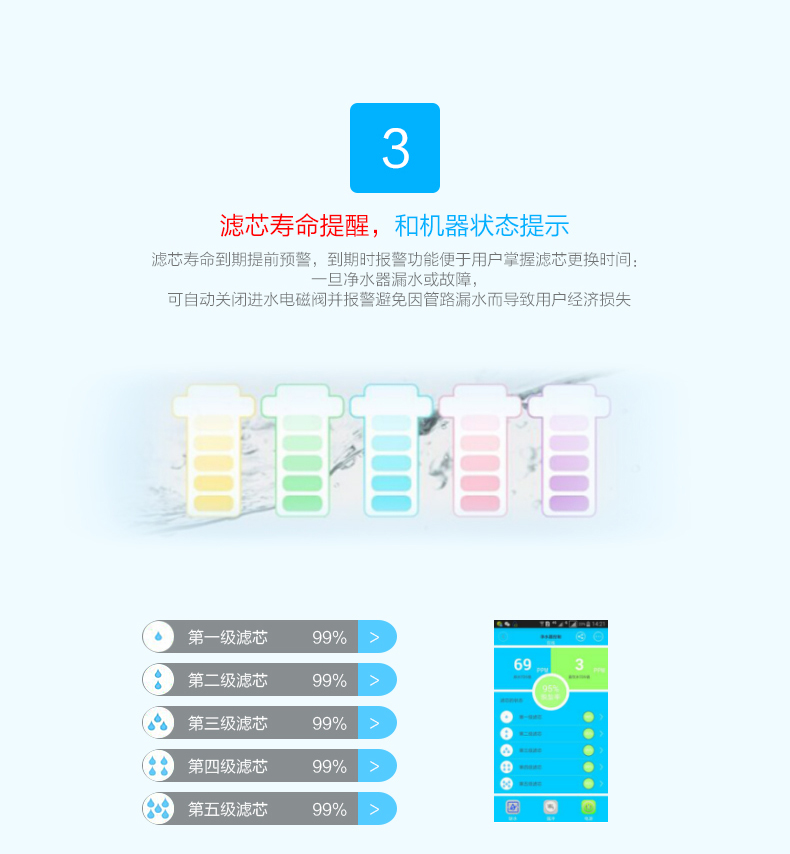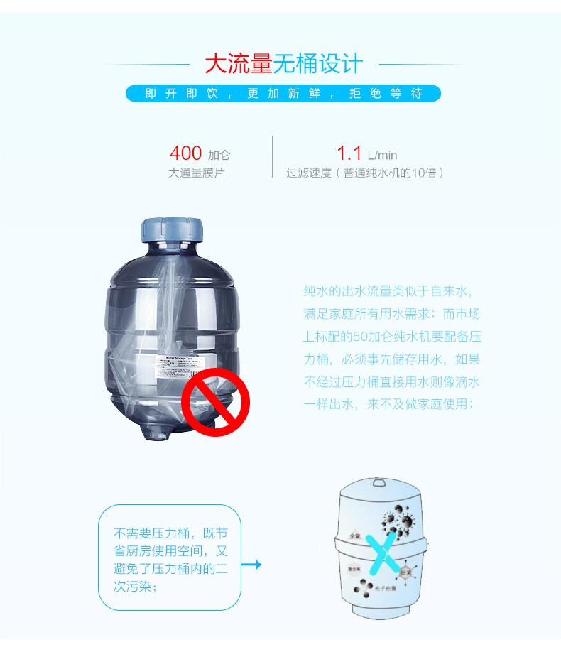 - 產(chǎn)品簡介:至純400加侖反滲透智能凈水機,無桶大流量設(shè)計,內(nèi)置TDS筆,并且與手機APP相連,是國內(nèi)頂級的家用純水機。